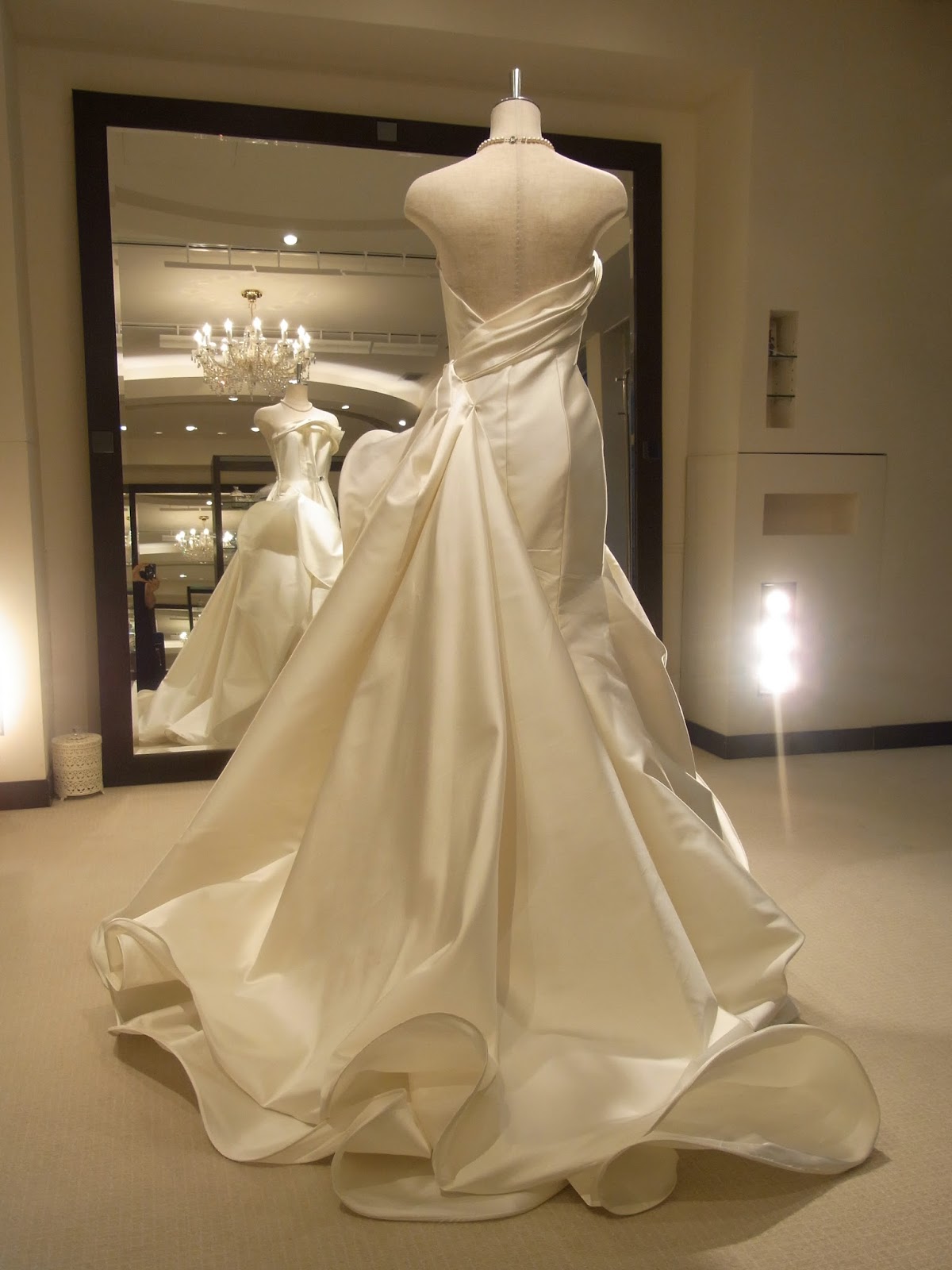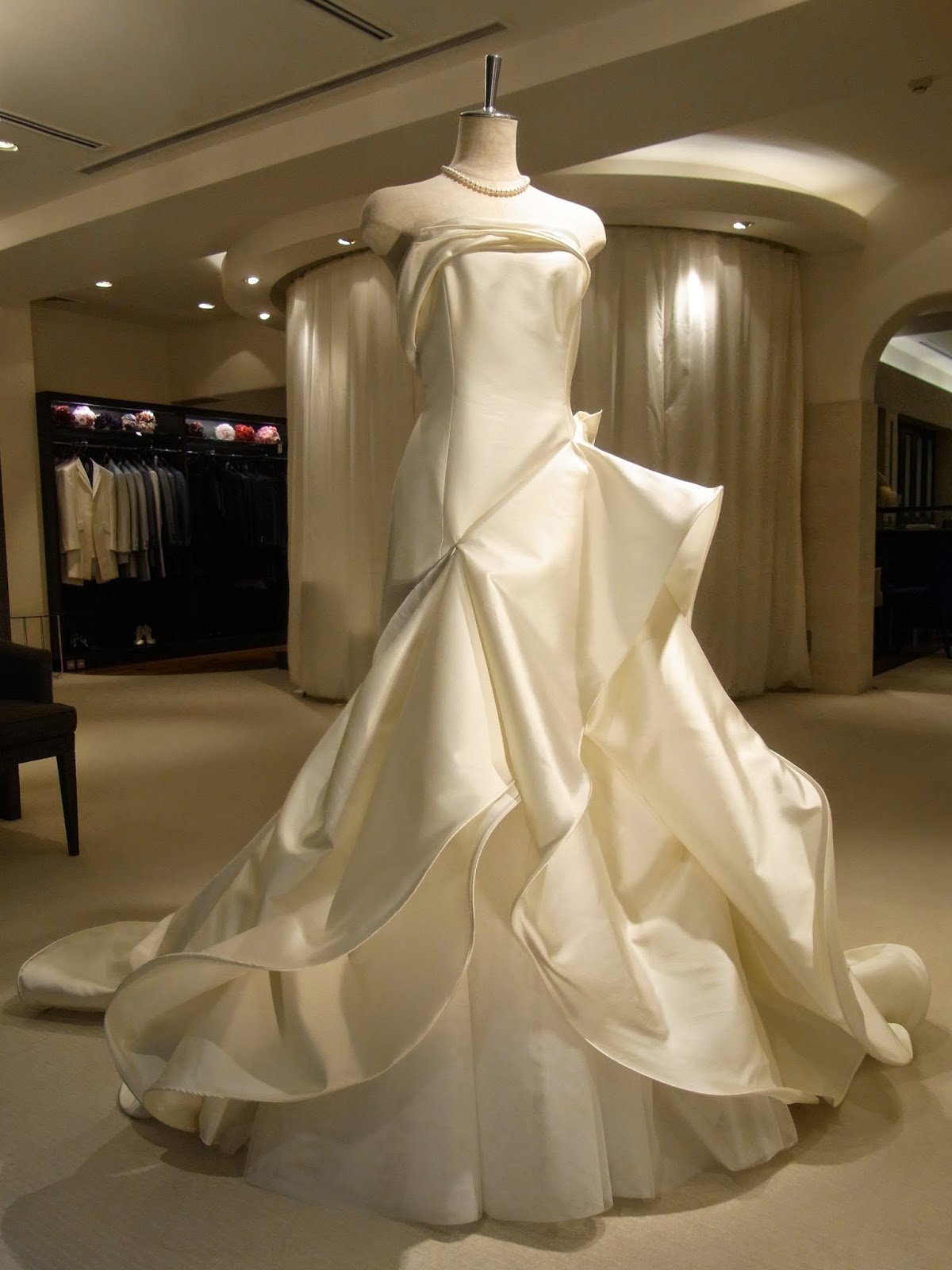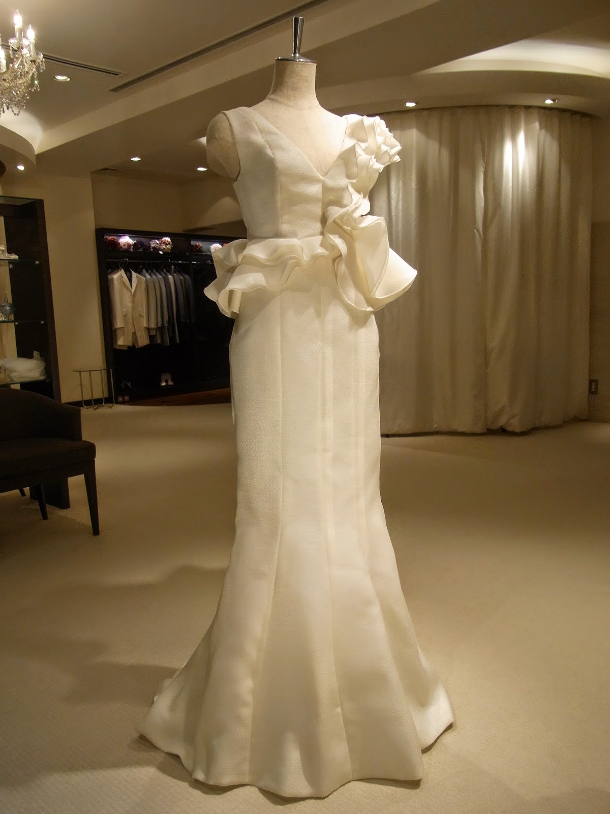 マーメイドラインのミカドシルクドレスに優雅に弾むように軽やかなホースヘアトレーン。上品でモダンな雰囲気はガーデンパーティにもピッタリ!